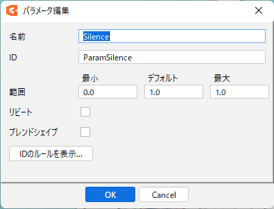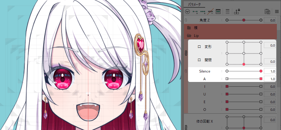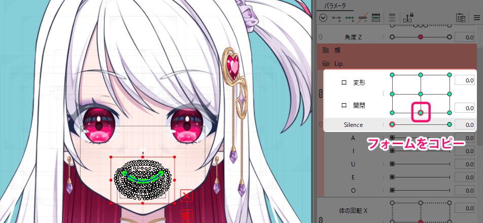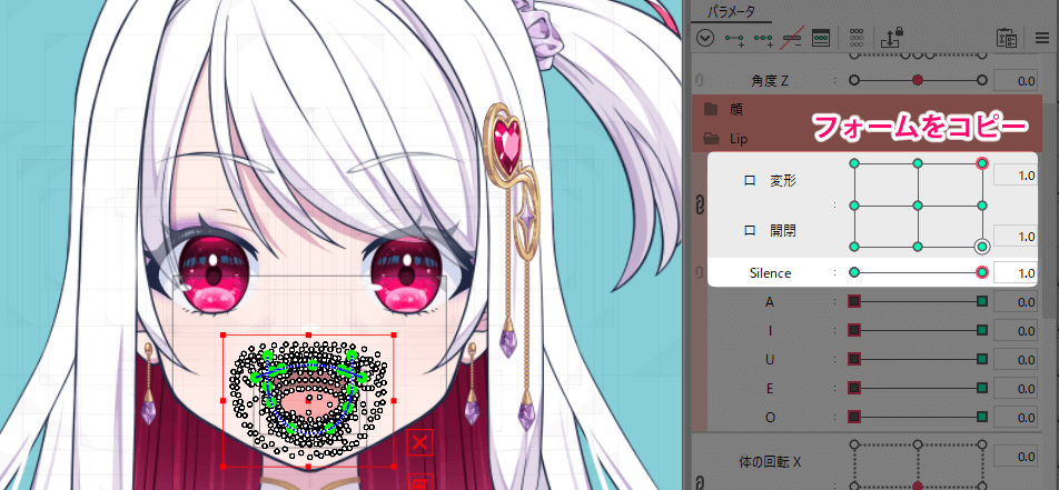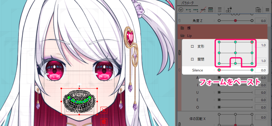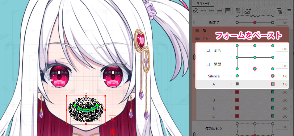 通常の口をデフォルトの閉じ口に戻してパラメーター「Silence」が1.0で「A」が1.0の状態で、先程コピーしたフォームをペーストします。