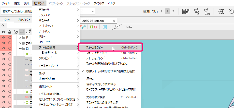 フォームをコピーは、「モデリング」→「フォームの編集」にあります。