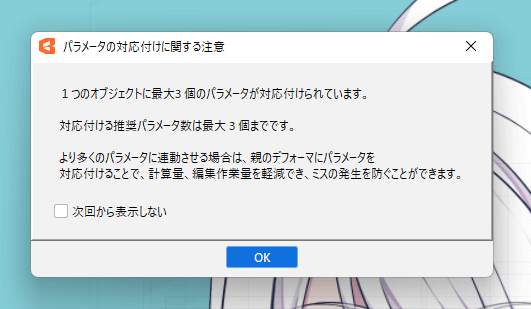 警告が出ますが、ブレンドシェイプなので問題ありません。OKを押して進みます。