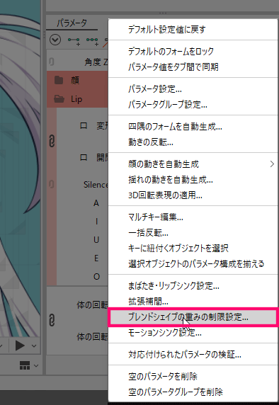 その中にある『ブレンドシェイプの重み制限設定』をクリックします。