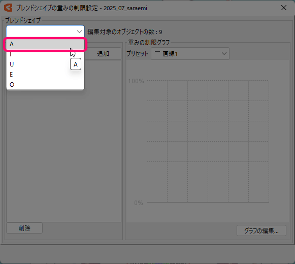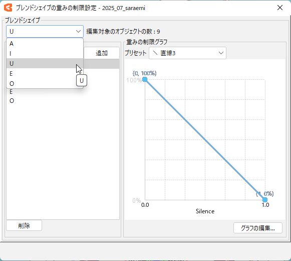 左上の一覧には、選択したパーツに付けられたブレンドシェイプが表示されます。