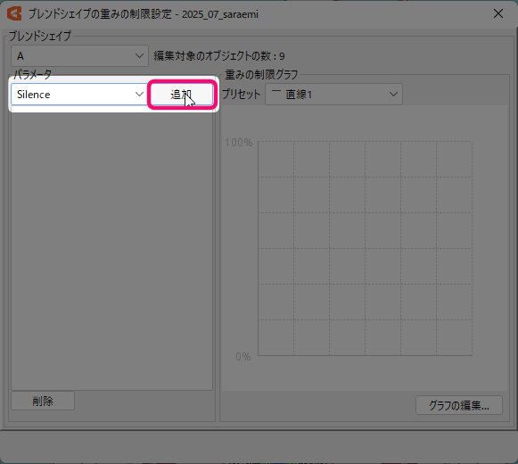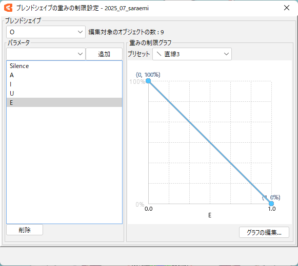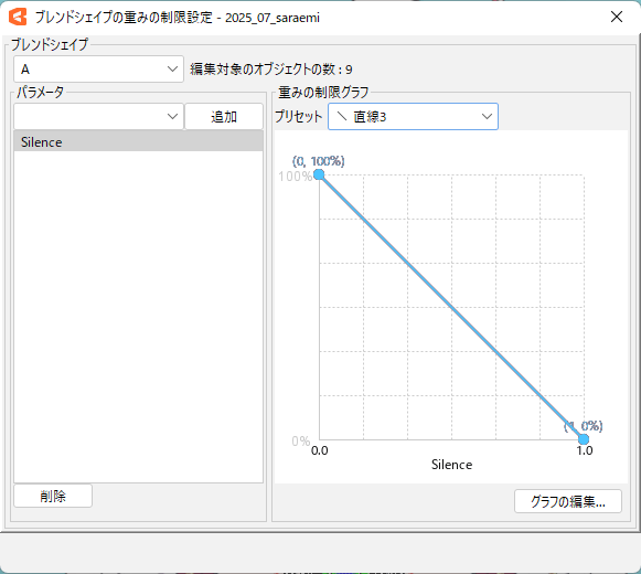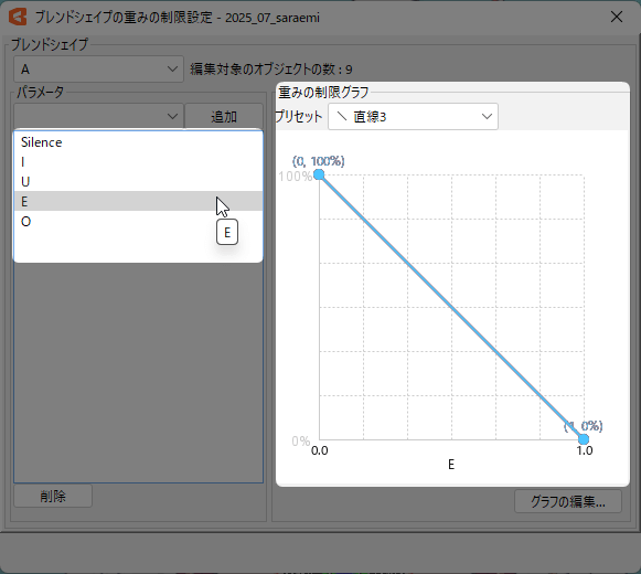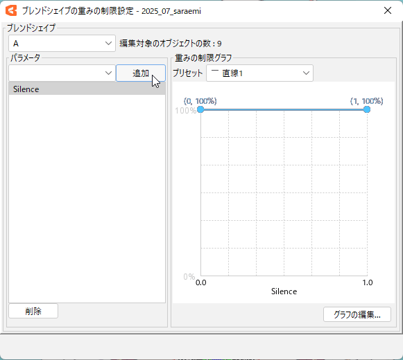 同様に「A」のまま、「Silence」と「A」以外の母音パラメーターにも『直線3』をつけていきます。