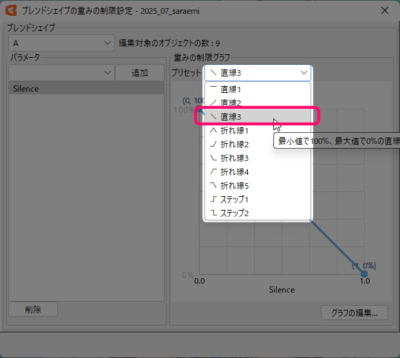 この状態で、『重みの制限グラフ』の「プリセット」で『直線3』を選びます。